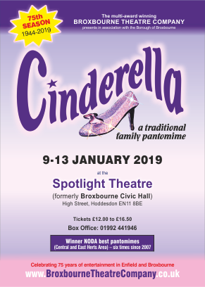 With the help of Buttons and our Fairy Godmother, no matter what tricks her Ugly Sisters and wicked Stepmother may try, Cinderella shall go to the ball ... meeting Prince Charming, Dandini and a huge cast of supporting characters. Join Broxbourne Theatre Company (formerly ETCEA) as it celebrates 75 years of entertainment in Enfield and Broxbourne.